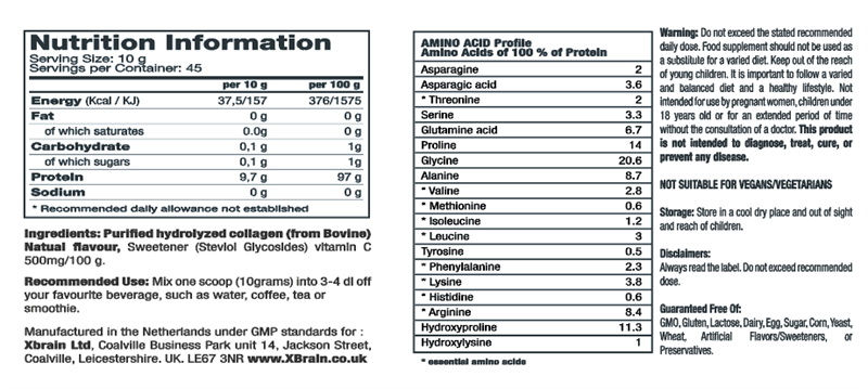 XBrain Collagen Vanilla contains ultra-purified collagen protein derived from ethically sourced, EU-regulated grass-fed cows, free from growth hormones, antibiotics, GMOs, and any other chemicals. The vanilla flavor is derived from natural vanilla extract and Luo Han Guo fruit extract (commonly known as monk fruit), which adds sweetness without the use of sugar or artificial additives.